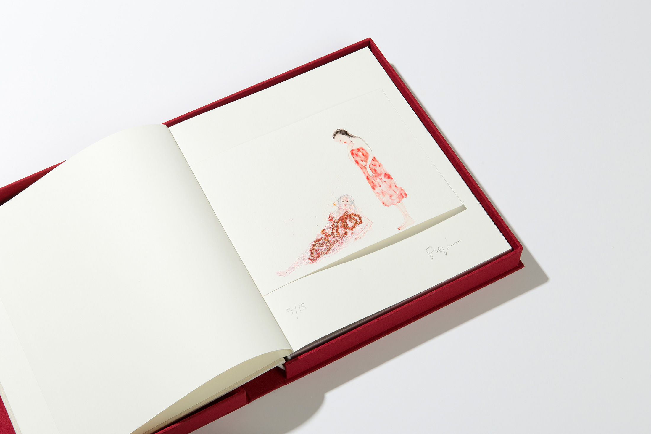 Design of the collector’s edition version of Penny Siopis’ Time and Again book. This hard cover version is bound with cream linen, with titles foil-stamped in magenta. The books have original drawings tipped in before the title pages, and come in a red solander box.